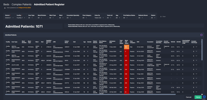 The Admitted Patient Register provides a live list of all current inpatients across your facility. Patients at the top of the list are considered more complex — based on factors such as longer length of stay, frailty, or predicted readmission risk.