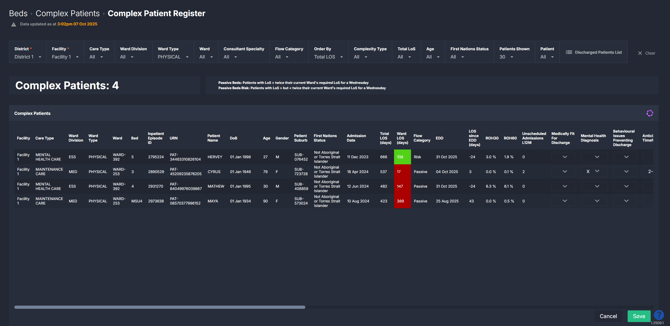 The Complex Patient Register provides a live view of all inpatients flagged as complex discharges in the Admitted Patient Register.