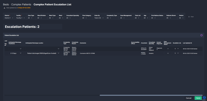 Complex Patients Table | Summarises patient details and discharge actions to keep complex cases visible and moving. Users can update Anticipated Discharge Timeframe and Anticipated Discharge Location fields to support planning and reporting. |