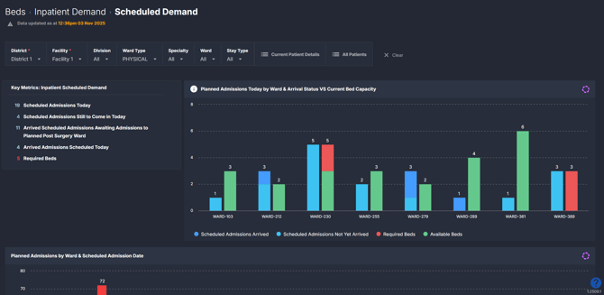 | Planned Admissions by Ward & Scheduled Admission Date | Charts upcoming planned admissions by ward across the next four weeks, showing expected daily volumes. |