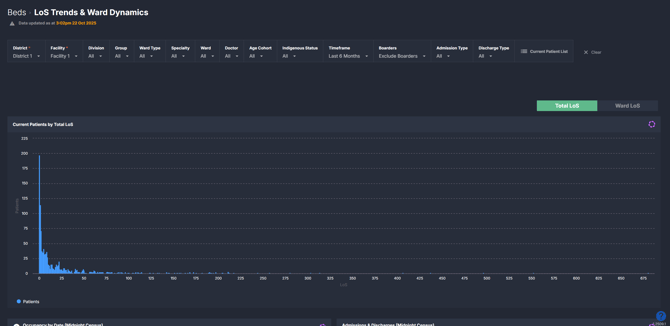 This component brings together historical and current inpatient activity so you can review occupancy, admissions, discharges, and length of stay patterns in one place. Use the filters to focus on your division, specialty, or ward, then switch between Total LoS and Ward LoS to change the lens of analysis.