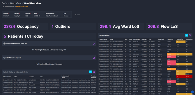 - LoS Trends & Ward Dynamics: Compare current ward performance to historical stay patterns and Flow LoS expectations.