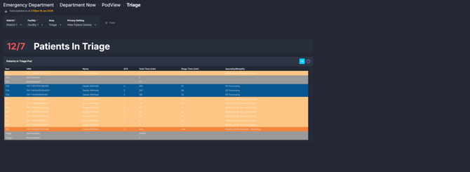 | Patients in Triage Pod | A patient list showing all patients waiting or present in triage, including ATS, total time, stage time, and current status. |