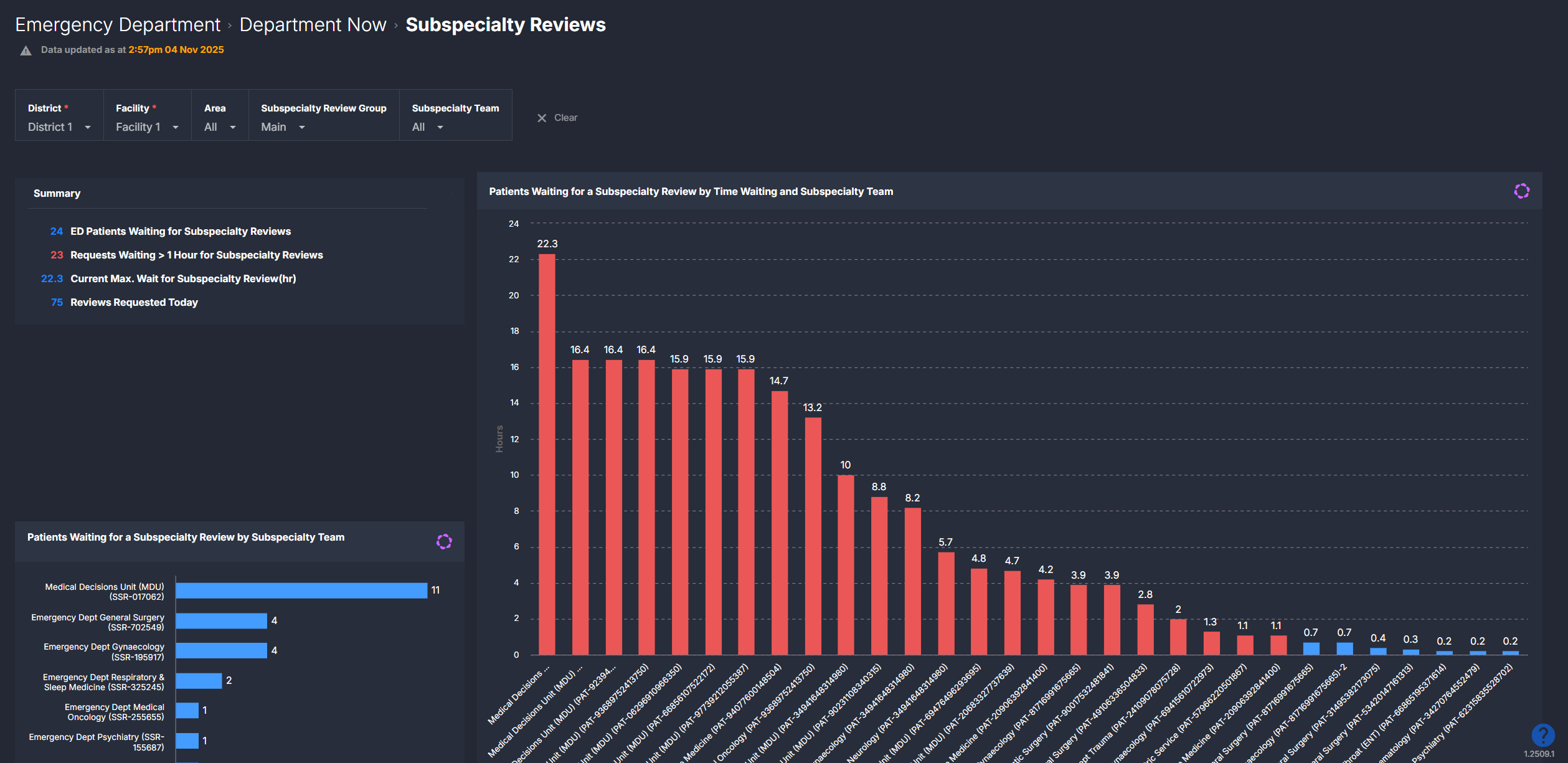 | Patients waiting for a Subspecialty Review by Area | Shows how many patients are waiting for a subspecialty review in each ED area, helping leaders balance patient flow and staff allocation. |