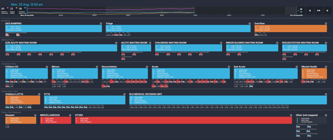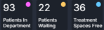 - Triage category: Patients in waiting areas are colour coded by their triage target time. As they approach or exceed their category-specific time-to-review KPI, their colour transitions from blue to orange to red, signalling that clinical review is due or overdue.