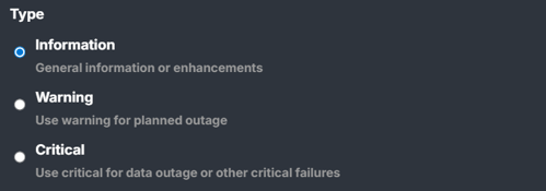 Used for planned changes or issues that may impact users (for example, deployments, data reloads, or outages) - ❗Critical (red)
