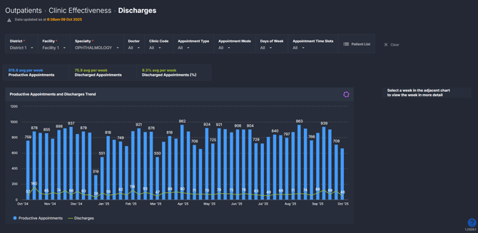- Drill into weeks: Identify which clinics or doctors have unusually low or high discharge rates.