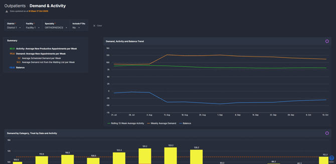 Demand by Category, Treat by Date and Activity | Breaks demand down by urgency or referral category and shows how many patients are due to be treated over the next 13 weeks. This view highlights where pressure is building and which categories are contributing most to demand. |
