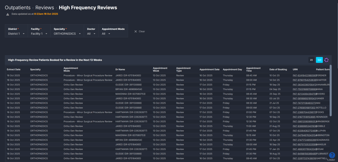 High Frequency Review Patients | A patient-level list of all individuals with review appointments booked in the next 13 weeks. The list is ordered by the total number of review appointments the patient has had in the past two years. |