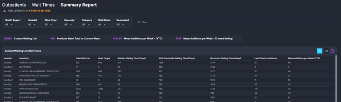 The Wait Times Summary Report provides a real-time overview of outpatient waiting list performance across hospitals and specialties. It combines key metrics and detailed wait time data to help users understand demand, delays, and overall system pressure.