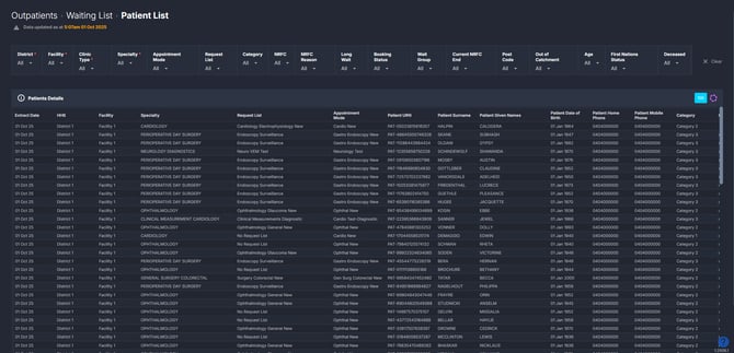 | Patient Details | A detailed table of all patients on the surgical waiting list. It includes over 50 columns of information, such as patient demographics, clinical category, booking status, treat-by dates, waitlist comments, referral source, and more. |