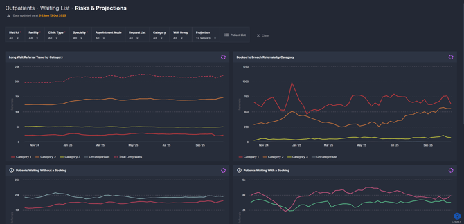 The Risks & Projections component helps identify outpatients who are at risk of breaching, or have already breached, their clinically recommended timeframe for treatment.