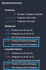 Operational Summary shows projected waiting list and long waits at the start and end of the projection period.