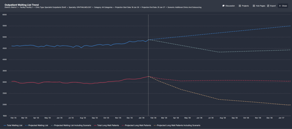 Outpatient Waiting List Trend displays baseline and scenario projections over time.