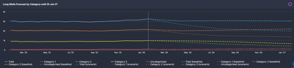 Use scenarios in the Outpatient Forecasting Tool › to explore how different service strategies may affect outpatient waiting list positions and long waits over time.