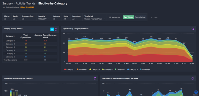 The Elective by Category component shows elective surgery activity over time, broken down by clinical priority and endoscopy categories. You can see how many cases were performed by each category and explore trends by specialty, doctor, and procedure. This helps you understand where elective workload is focused and how it changes week by week.