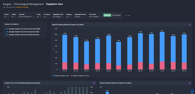 The component aggregates treated-in-turn data for all completed and scheduled surgeries. As you drill down, the charts dynamically recalculate based on the selected specialty, doctor, or procedure.