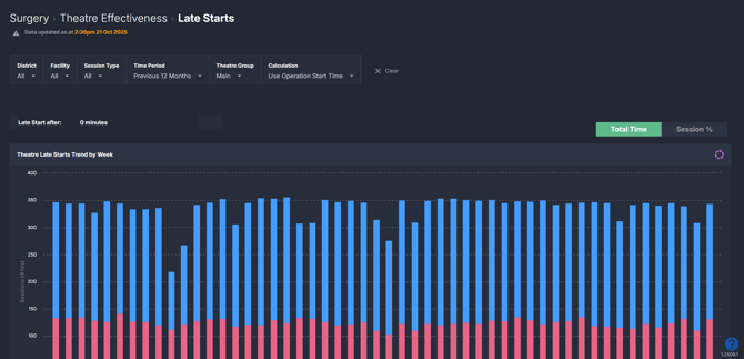 The Late Starts component measures and visualises the proportion of total available theatre time lost due to sessions beginning later than scheduled.