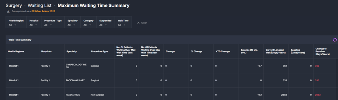 | Wait Time Summary | A table summarising patients waiting above the selected maximum wait time threshold, broken down by Health Region, Hospital, Specialty, and Procedure Type. Includes week-on-week comparison, percentage change, year-to-date movement, and longest wait metrics. |