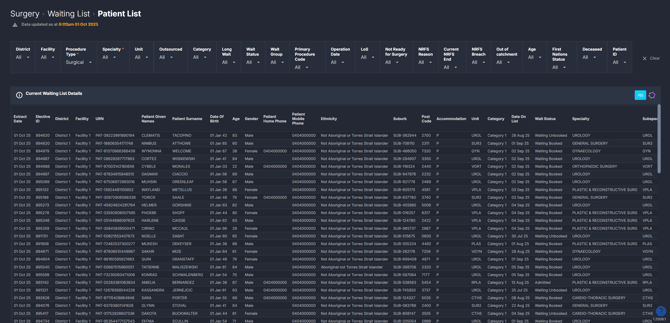 Current Waiting List Details | A detailed table of all patients on the surgical waiting list. It includes over 50 columns of information, such as patient demographics, clinical category, booking status, treat-by dates, procedure details, doctor, and more. |
