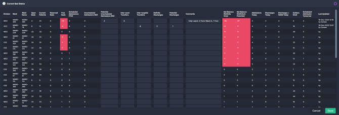 | Net Balance (Definite Only) | The ward’s current bed balance using confirmed information only from the source system and user input. | Open Beds minus Current Patients, Reserved Beds, Scheduled Admissions (TCI), Unscheduled Admissions (ED), Inter-ward Transfers, Inter-hospital Transfers plus Definite Discharges |