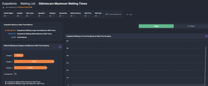SystemView uses outpatient referral and waiting list data from the source system to calculate how long each patient has been waiting. This is compared against Sláintecare maximum wait time targets to classify patients as either within or beyond target.