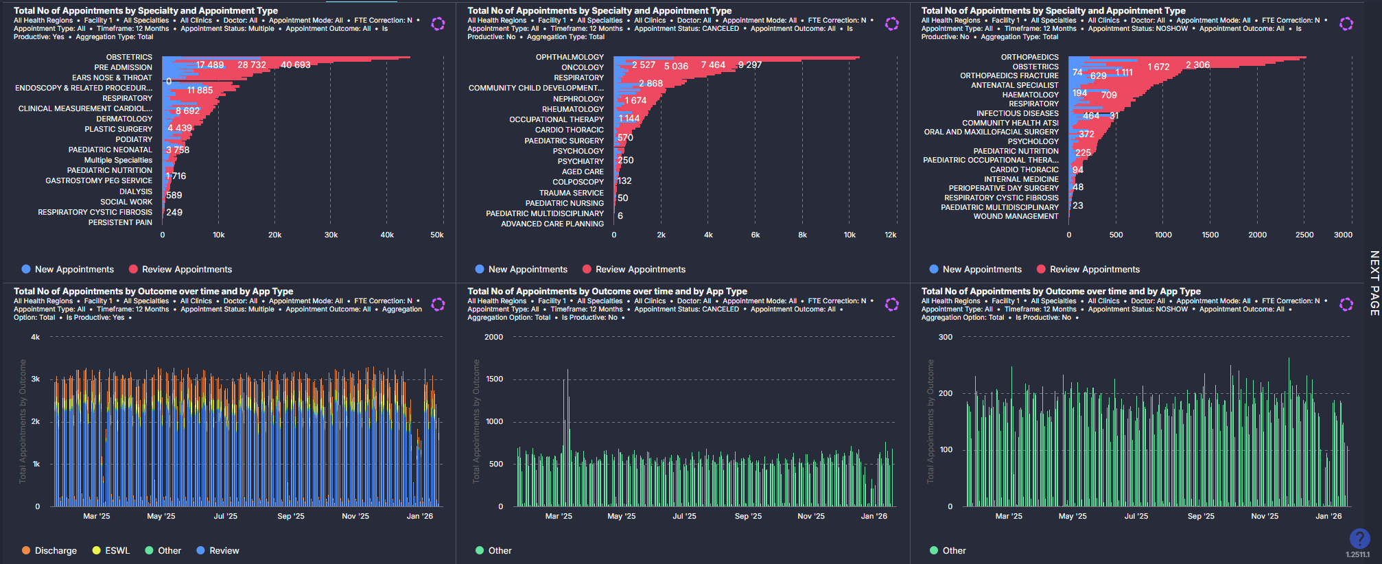 This project provides an overall OPD view across specialties. It shows total productivity with outcomes alongside non-productive appointments, including DNAs and cancellations. The goal is to identify the specialty with the highest number of DNAs and cancellations.