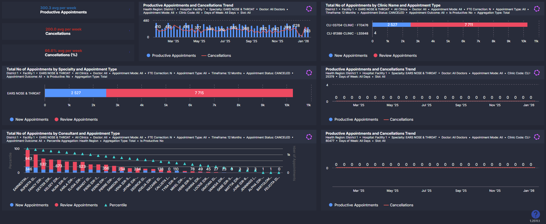 This is a deep dive into the specialty once we identify the specialty with the highest number of cancellations. It shows the average number of cancellations per week, with percentages and trends over 52 weeks. You can drill down into doctor-level and clinic-level cancellations to see trends and identify where the underlying issues are.